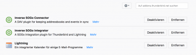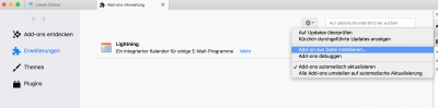 Zahnrad neben der Suchleiste klicken → Add-on aud Datei installieren… → Sogo Connector und Sogo Integrator einzeln auswählen und Öffnen